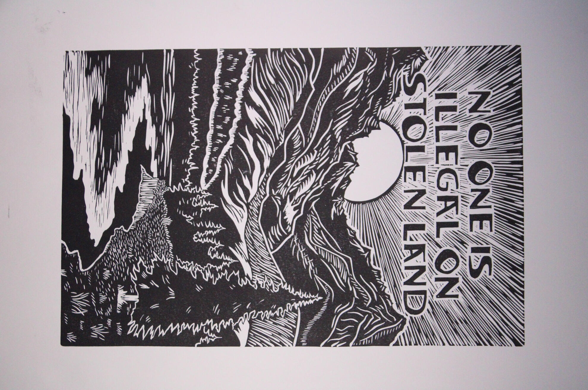 A series of 3 reductive 12x18 linoleum carvingsFeaturing "No one is illegal on stolen land" with a mountain, forest, cliffside landscape