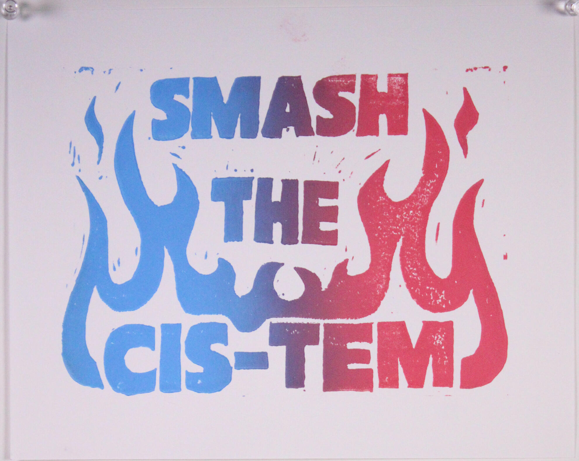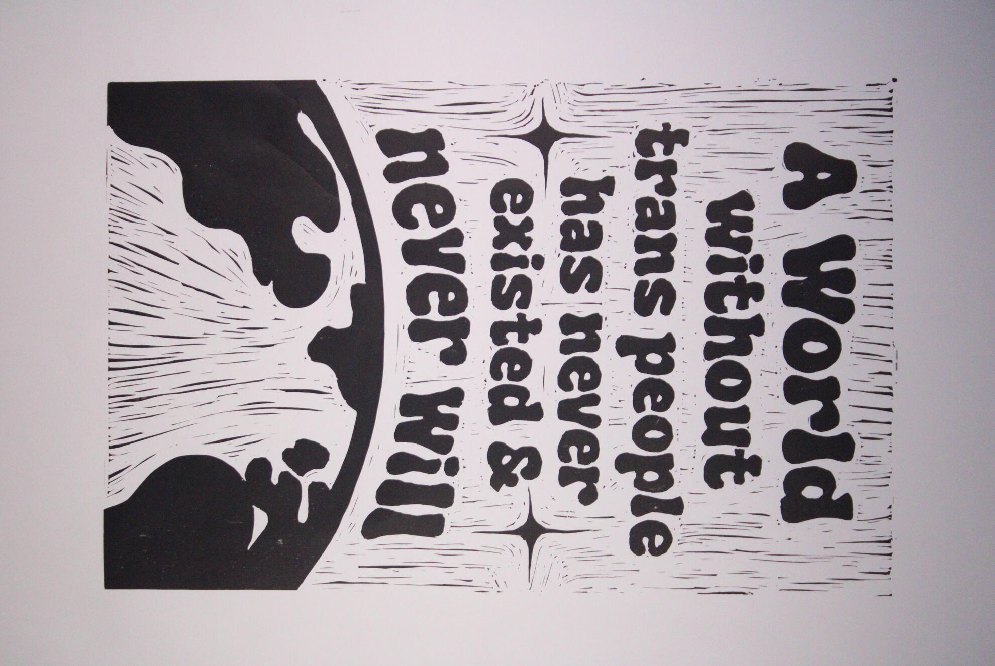 A series of 3 reductive 12x18 linoleum carvingsFeaturing "A World without trans people has never existed & never will" with stars and a stylized globe