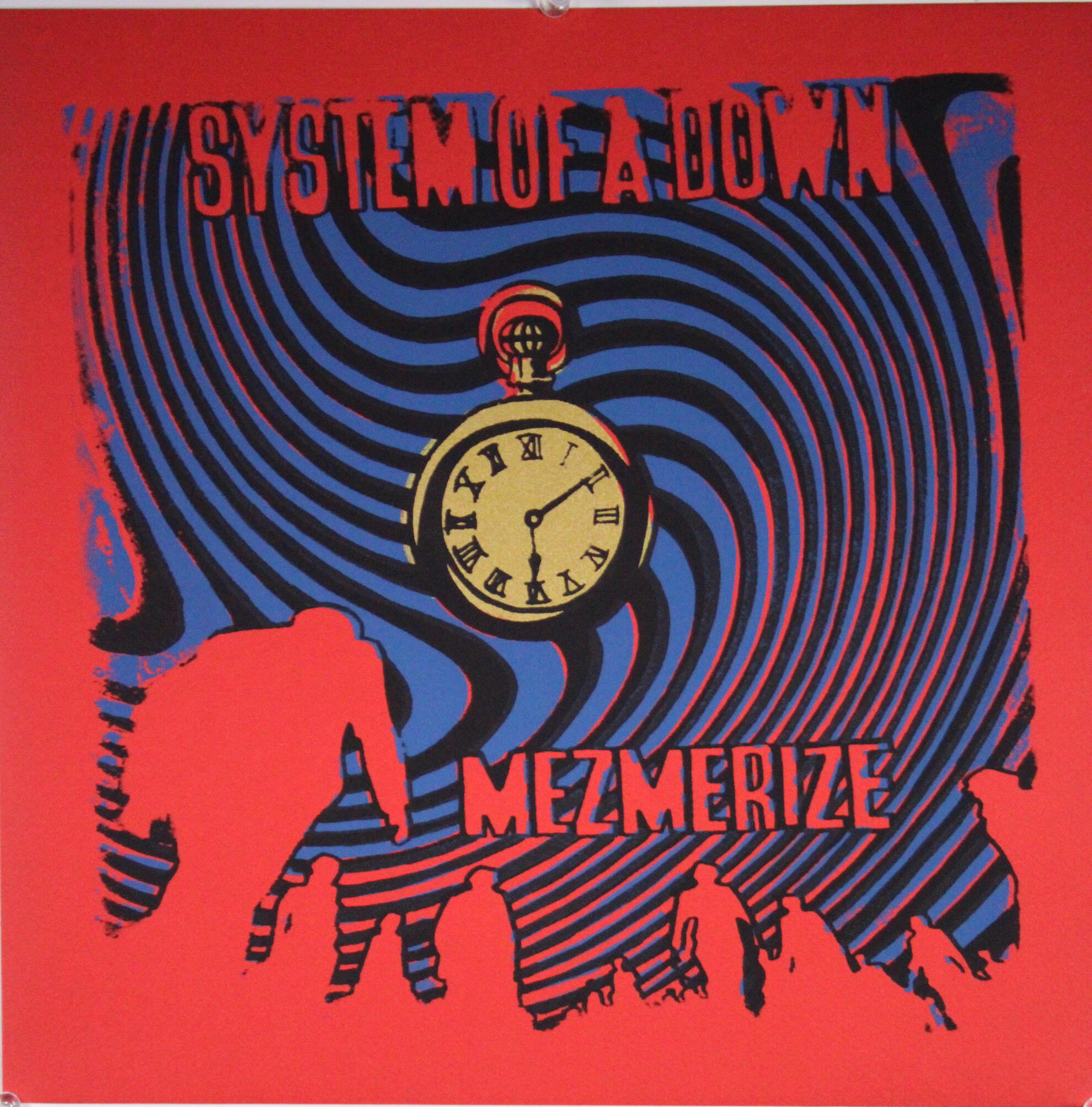 Personal design of "Mezmerize" album by System of a Down screen printed in three layers of gold, blue, and black