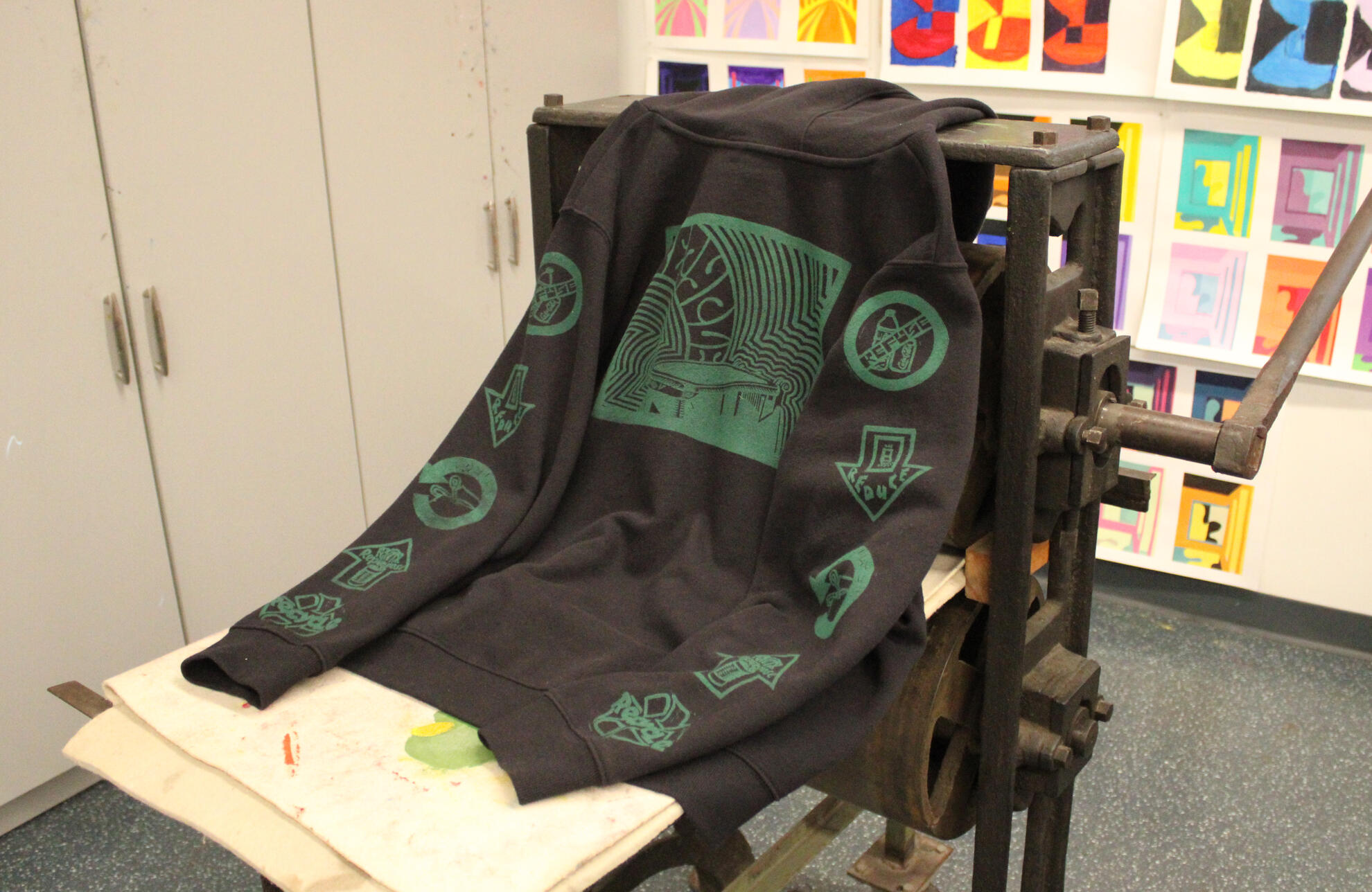 A recycled sweatshirt printed with green linoleum stamps featuring the 5 R's of Recycling: Refuse, Reduce, Reuse, Repurpose, and Recycle